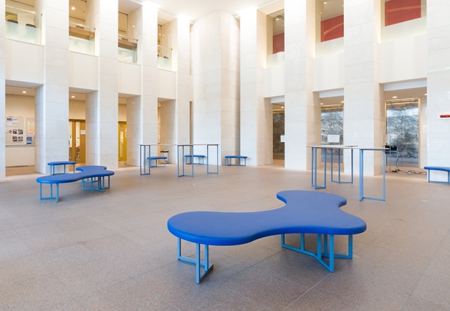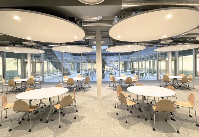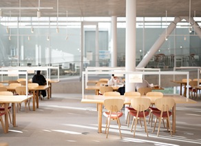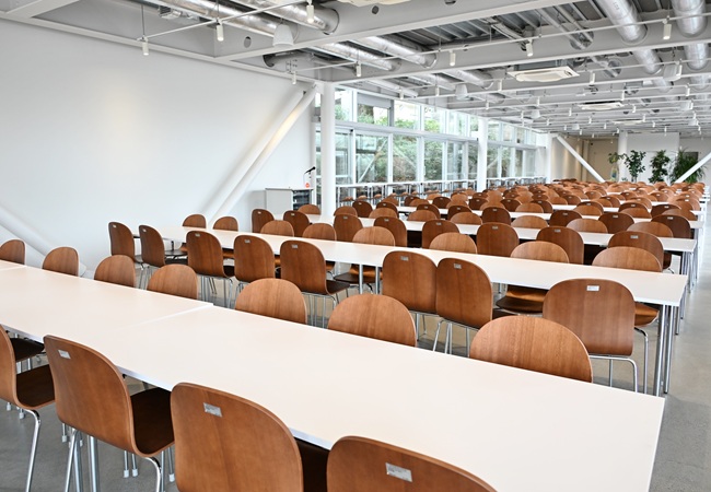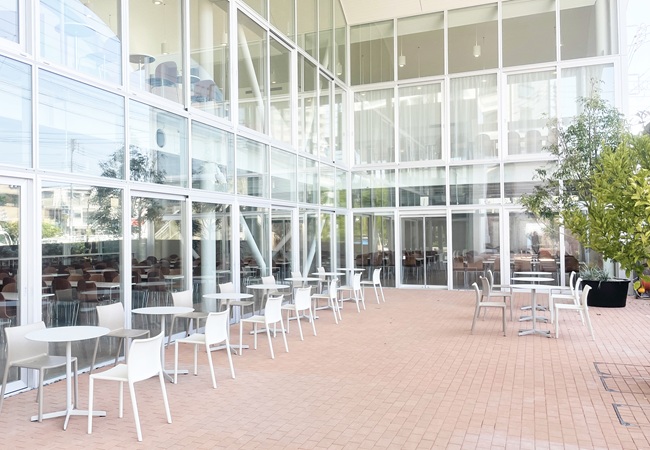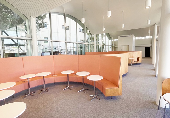 学生が自由に利用できる滞在スペース。1階は昼休み等の利用者が集中する時間帯にも対応できるよう約300席が並び、2階は曲線的なソファーで個々のスペースを確保し、友人との対話を楽しんだり、1人で静かに過ごしたりすることができます。ミーティングスペースには、プロジェクターを配備し、ミニイベントも開催可能です。1階外のテラス席では、日替わりのキッチンカーで提供される食事やデザートを楽しむことができます。