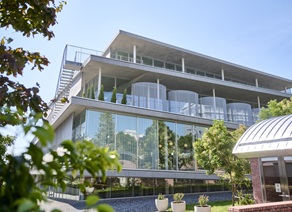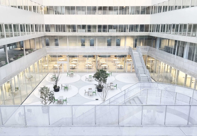 主に学生の滞在スペース、イベントスペース、隣接する豊明幼稚園の園児の保護者の休憩スペースとして使用しています。新規建物共通のヴォールト状の屋根が特徴的な建物。目白通り沿いに面し、ガラス張りの壁面を採用することで、学生の活躍を地域の方に発信する場の機能を持たせています。