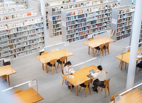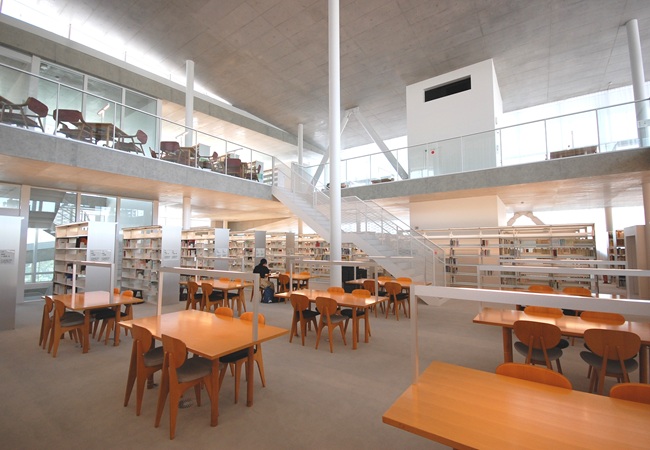 地上から地下に広がる書架スペース、各階にちりばめられた閲覧スペース。 4階のフロアまでを回遊するようにスロープがつながる開放的な図書館です。「全開架式」が特徴であり、利用者は全ての書架に直接アプローチでき、また全館無線LANが利用可能です。「JWUラーニング・コモンズさくら」では、図書館の資料やデータベースを使用して、自由に様々な学修活動ができます。