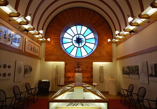 内部には記念室・瞑想室、展示室、図書閲覧室などがあり、展示室では年4回ほどの展示替により、主に学園史を中心にした資料の紹介をおこなっています。学園の文書館、博物館として、様々な活動をおこなっている記念館ですが、学園外の方々でも自由に入館することが出来ます。