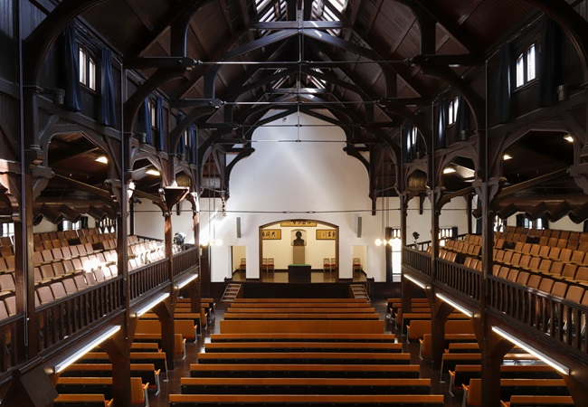 式典やイベントなどで利用される講堂。1階席は467席、2階席は119席(側廊のイスを除く)あります。1906(明治39)年に「豊明図書館兼講堂」として建設されました。1923年の関東大震災で大きな被害を受け、翌年に創建時の部材を丁寧に保存・使用して修繕。天井を支える木骨トラスやステンドグラスなどは創建時のままです。壇上には創立者成瀬仁蔵晩年の書による本学三綱領が掲げられ、その中央に設置してある「成瀬仁蔵胸像」は高村光太郎の作品です。この講堂は1974(昭和49)年に文京区の有形文化財に指定されています。